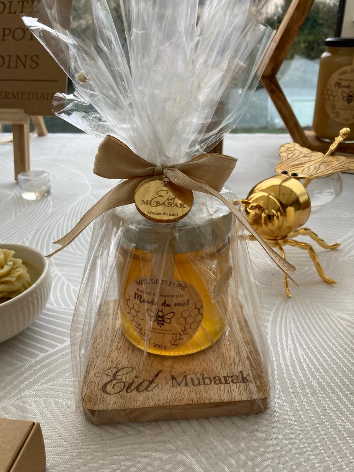 Célébrez l’Eid avec élégance grâce à notre pot de miel 300g, tout fleurs, accompagné de son charmant plateau en bois gravé ‘Eid Mubarak’. Cet ensemble combine la douceur du miel pur et l’esthétique naturelle du bois, pour un cadeau qui ravit autant les papilles que les yeux.